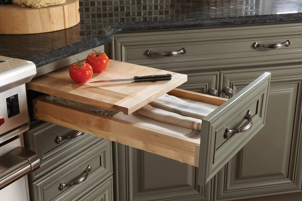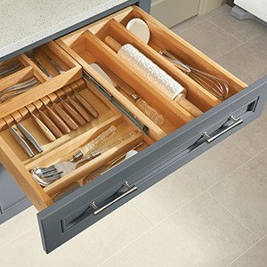 The utensil drawer and knife drawer have both grown in popularity, and if you have the space, I suggest including both. They allow a cook to have all of their utensils and knives right within reach and organized, so you never have to spend time searching for that one spoon or your favorite chef's knife. Slats — whether built into the drawers or purchased as an insert — are your best friend here. They keep everything separated, which is just as important for organization as it is for keeping your knives in great shape.